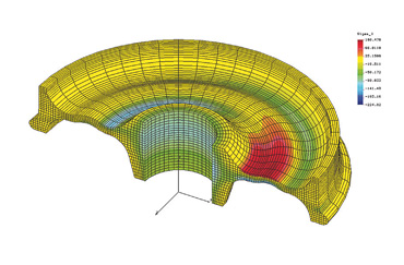 GHH-BONATRANS provádí ověřování konstrukcí jak analyticky (například pevnostní výpočty náprav), tak metodou konečných prvků „MKP“ (například pevnostní návrhy kol). Máme zkušenosti s návrhem a výpočty dle norem EN, AAR nebo GOST. Naši specialisté také vyvinuli speciální výpočtové postupy, například pro návrh dle AAR S-669, termomechanickou analýzu brzděných kol, nebo výpočty pryží odpružených kol včetně vlivu pryžových segmentů.